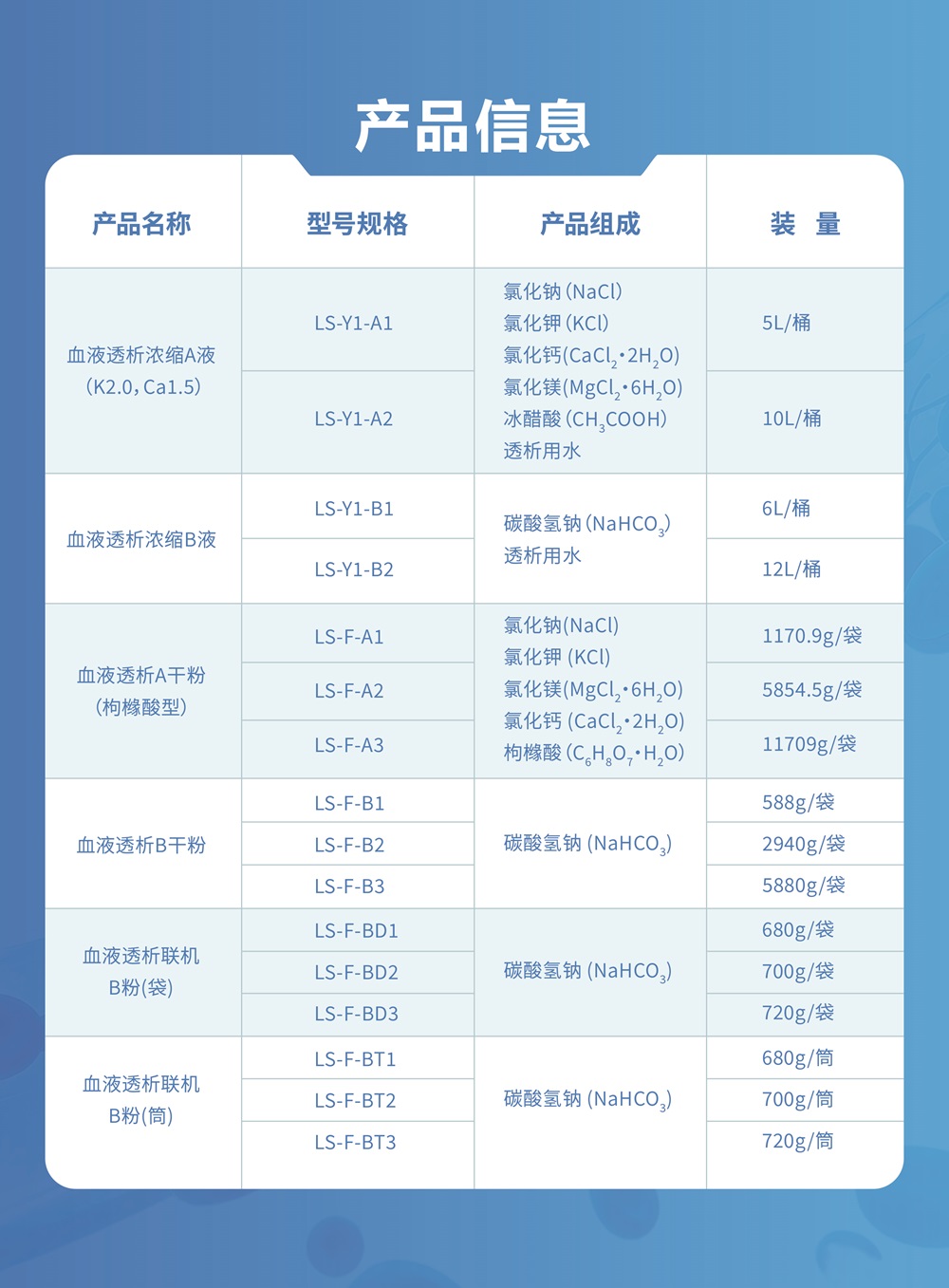 目前透析治疗中绝大多数患者使用常规浓度的透析浓缩物(钾2.0,钙1.5型),而产品中的有机酸成分主要为透析液使用冰醋酸、透析干粉使用枸橼酸。公司产品共16种型号规格,囊括了透析液、透析干粉、联机B干粉等产品的各种装量规格,能够匹配各主流品牌的血液透析机,满足透析中心对产品的使用需求。