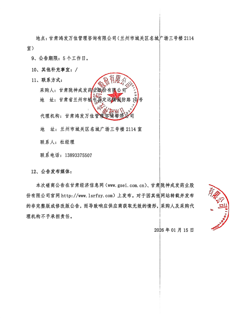 甘肃陇神戎发药业股份有限公司2026年度聚乙二醇6000采购项目(二次)竞争性磋商公告