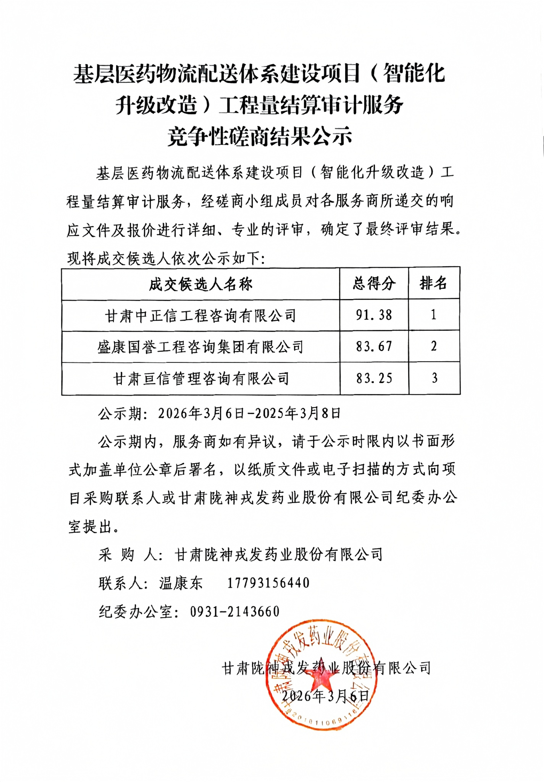 基层医药物流配送体系建设项目(智能化升级改造)工程量结算审计服务竞争性磋商结果公示