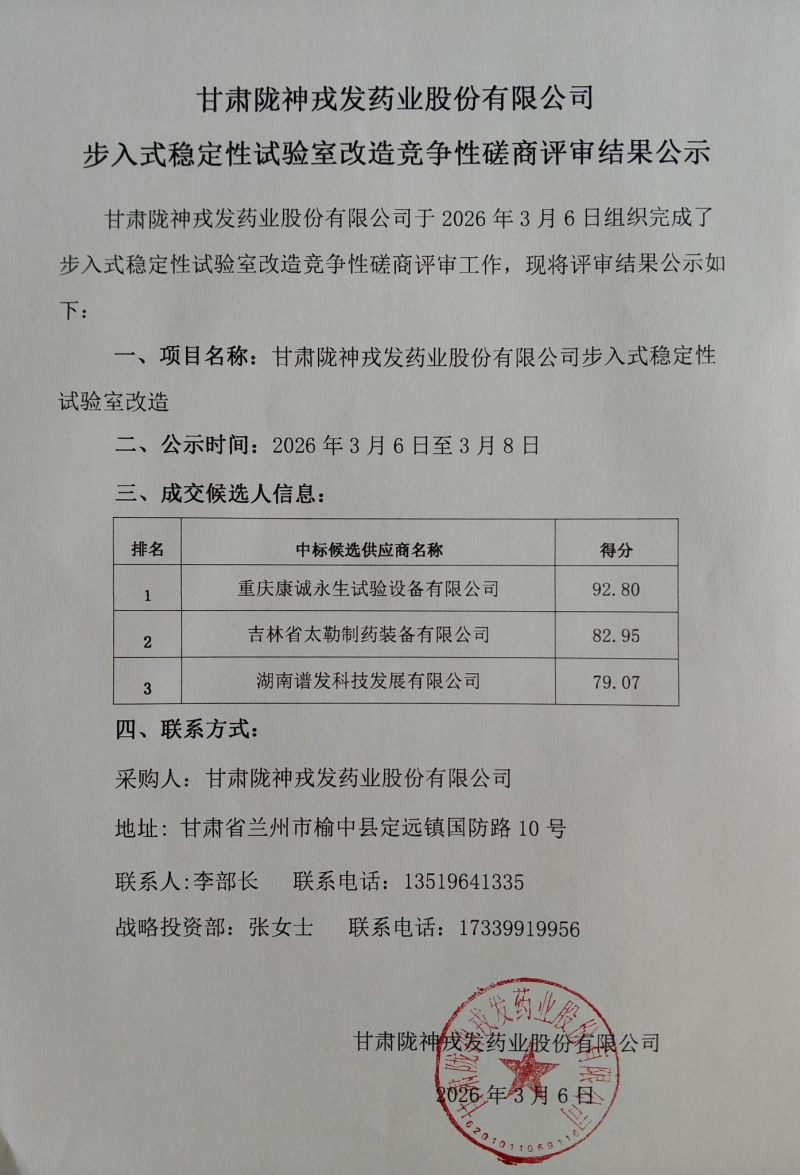 甘肃陇神戎发药业股份有限公司步入式稳定性试验室改造竞争性磋商评审结果公示