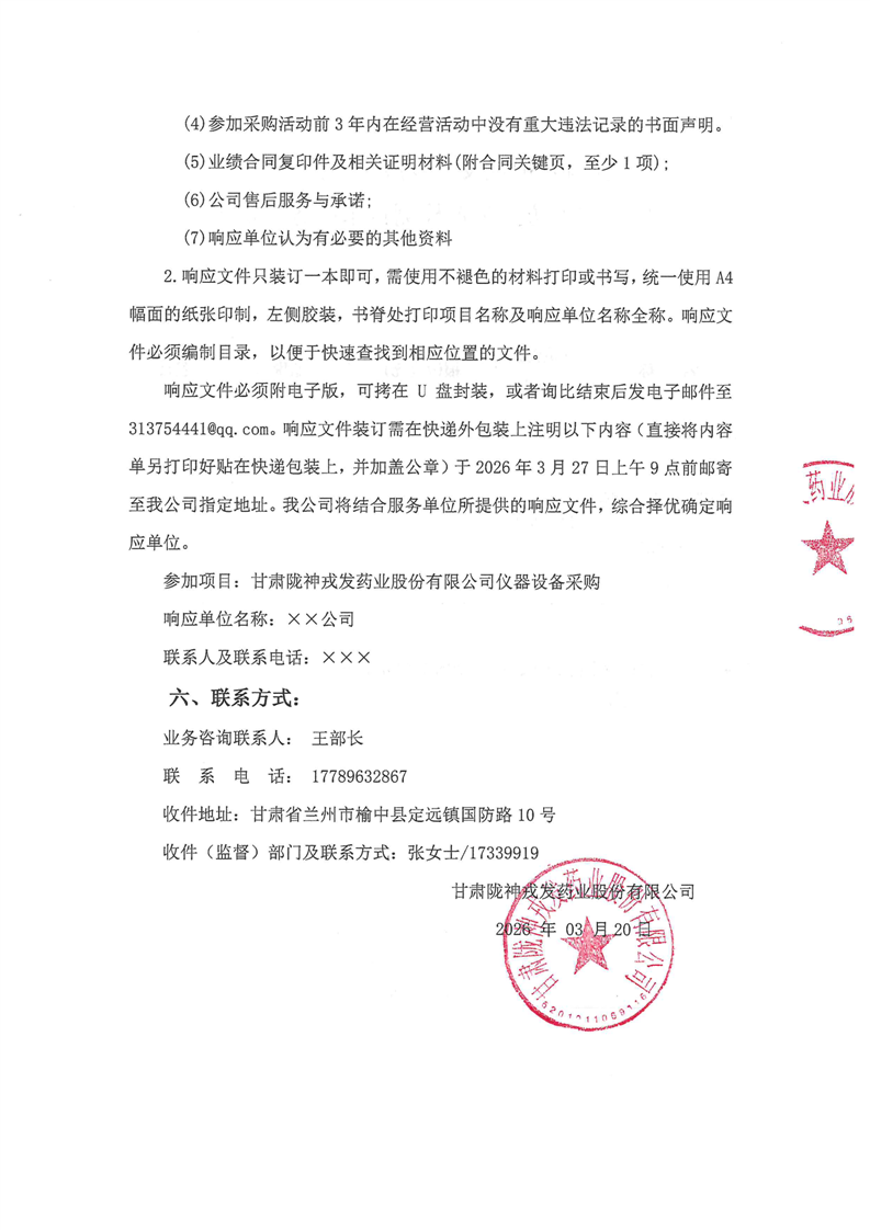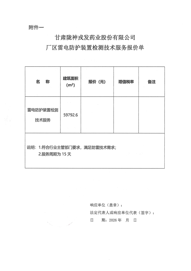 甘肃陇神戎发药业股份有限公司厂区雷电防护装置检测技术服务询价公告