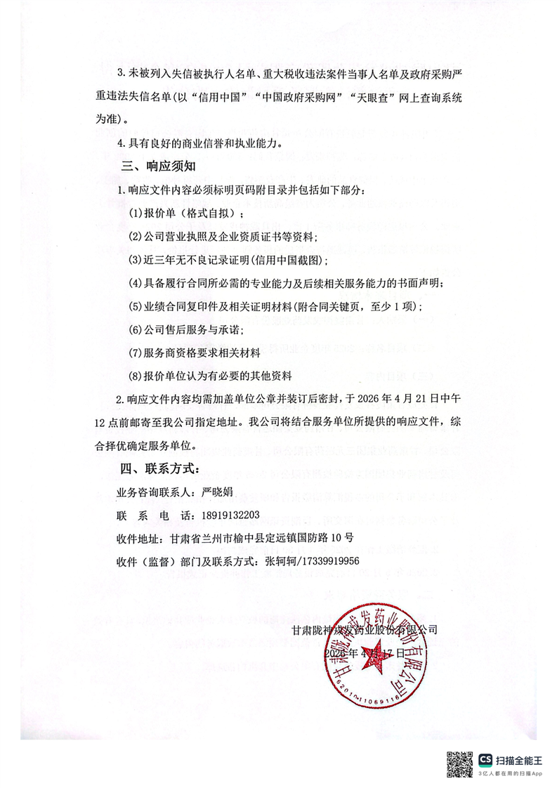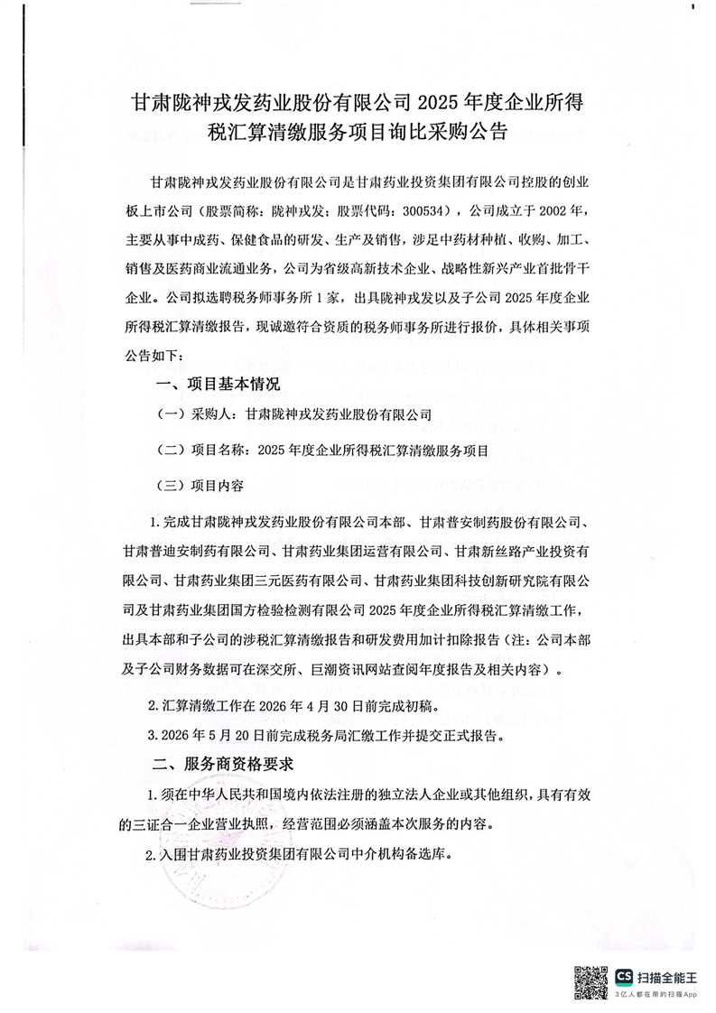 甘肃陇神戎发药业股份有限公司2025年度企业所得税汇算清缴服务项目询比采购公告