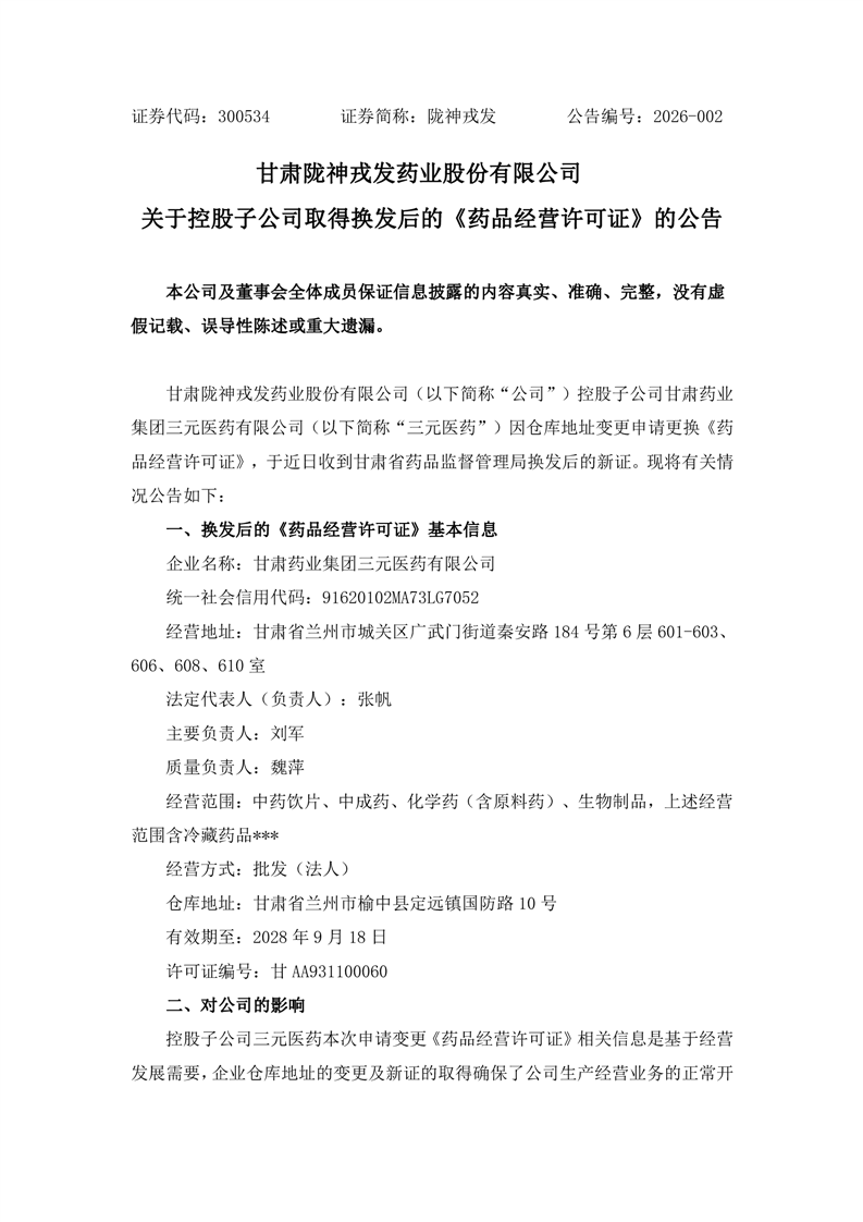 关于控股子公司取得换发后的《药品经营许可证》的公告
