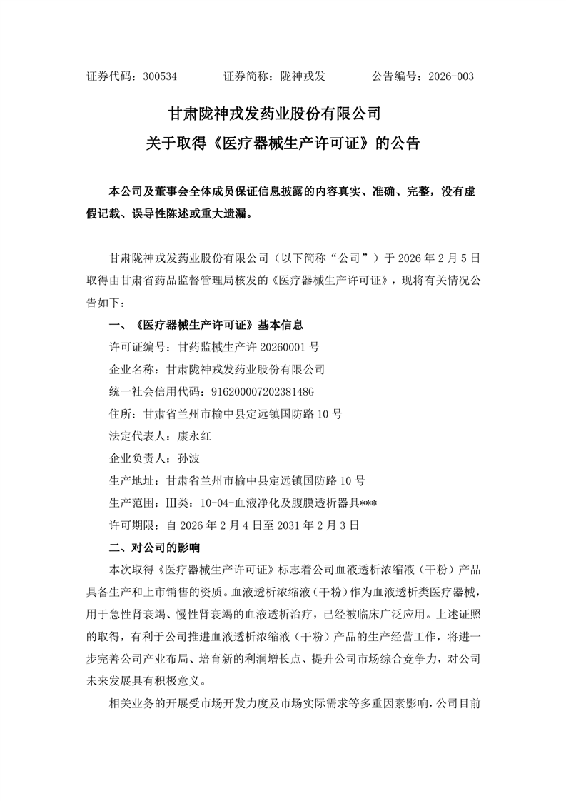 关于取得《医疗器械生产许可证》的公告