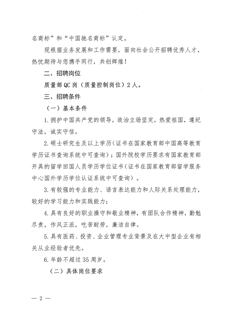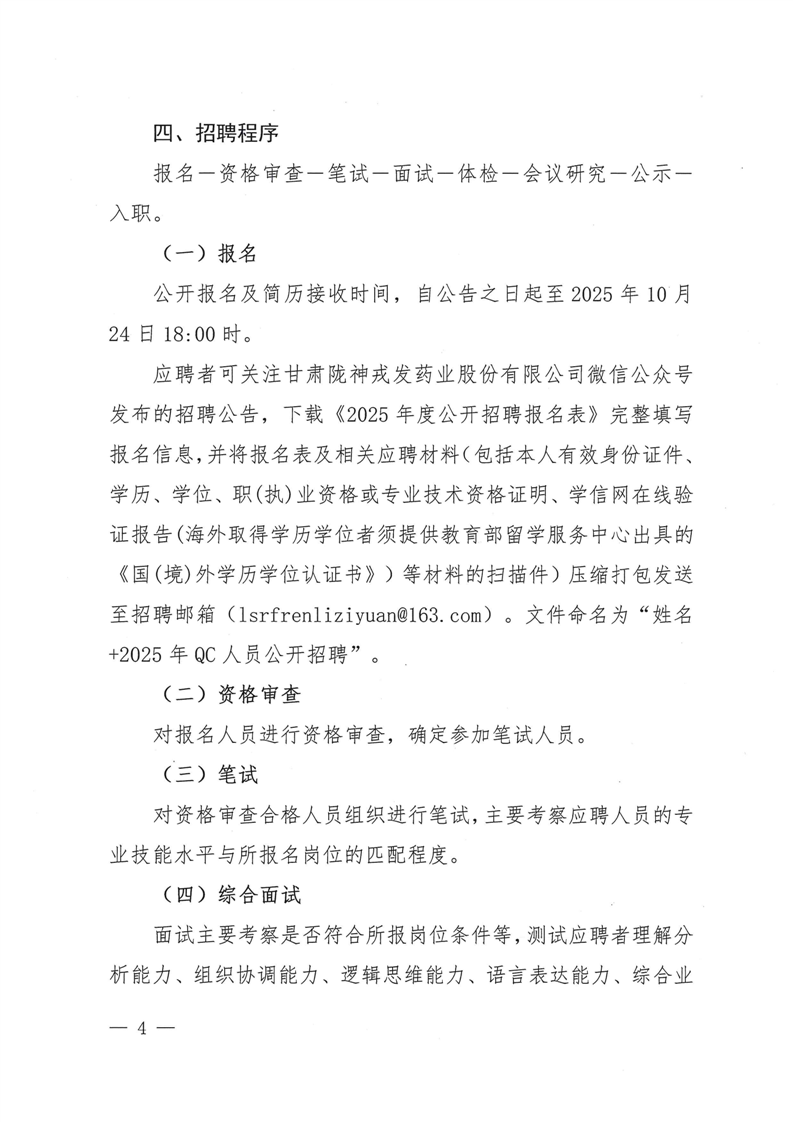 甘肃陇神戎发药业股份有限公司关于公开招聘质量控制岗位人员的公告
