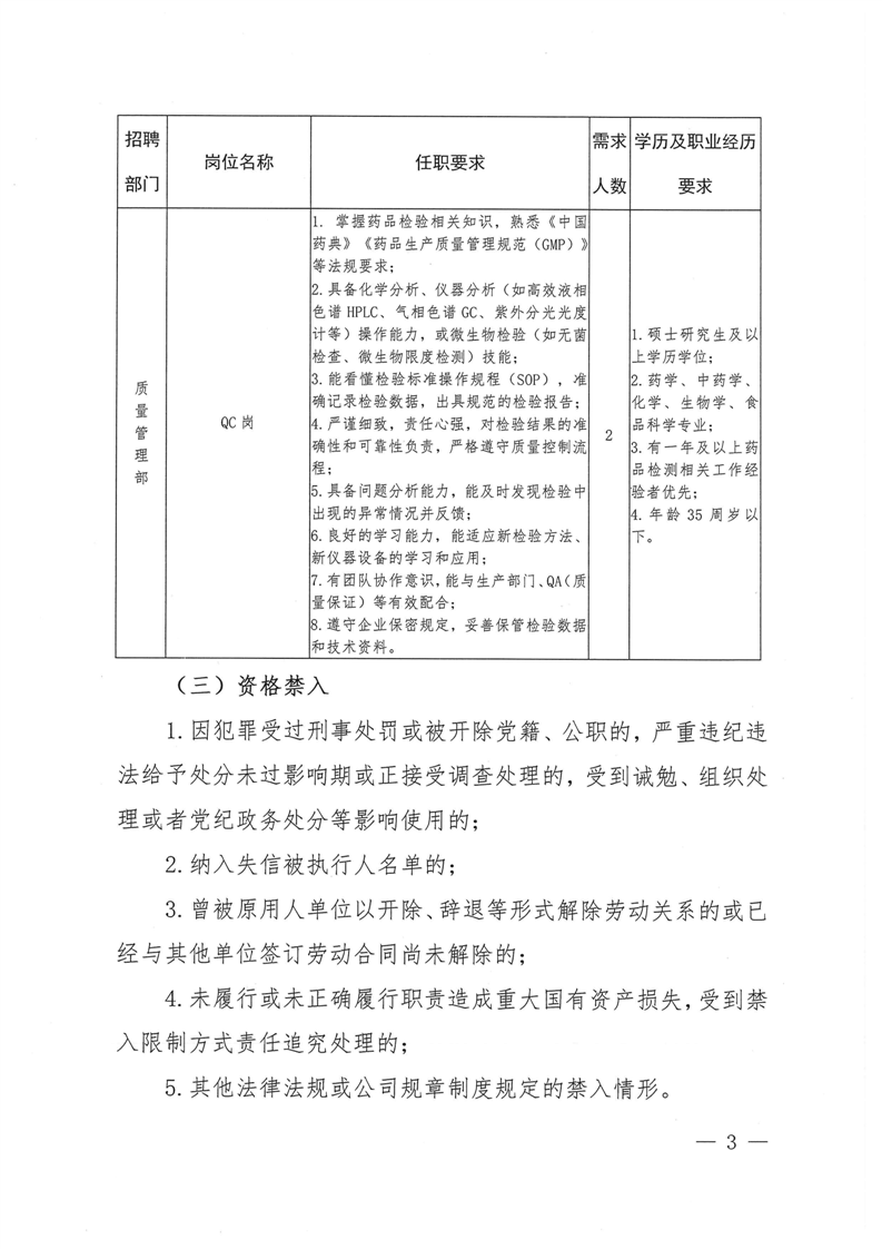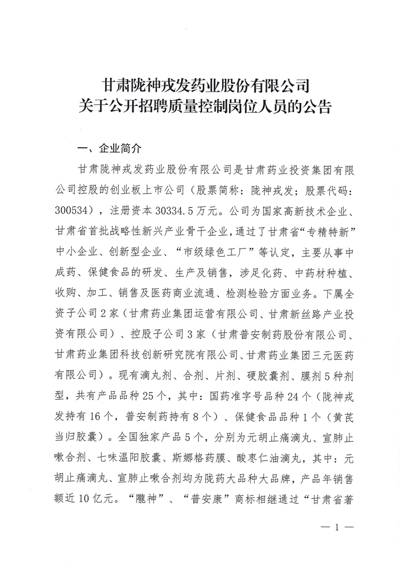 甘肃陇神戎发药业股份有限公司关于公开招聘质量控制岗位人员的公告