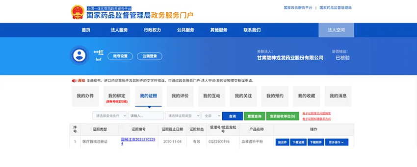 目前,根据官方网站查询:陇神戎发为甘、青、宁、新等西北省份首家申报,并成功取得该产品注册证书的企业,标志着公司在持续稳固中成药开发生产的同时,正式涉足医疗器械领域,这将有利于公司进一步拓宽产业布局,丰富优化产品结构,实现业务多元化发展,积极带动西北地区医疗器械事业发展,有效填补西北市场空白。