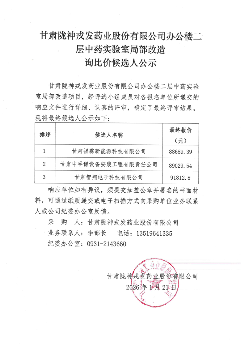 甘肃陇神戎发药业股份有限公司办公楼二层中药实验室局部改造询比价候选人公示