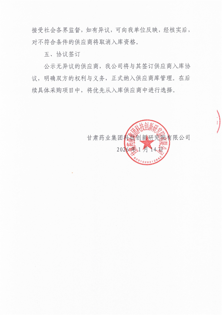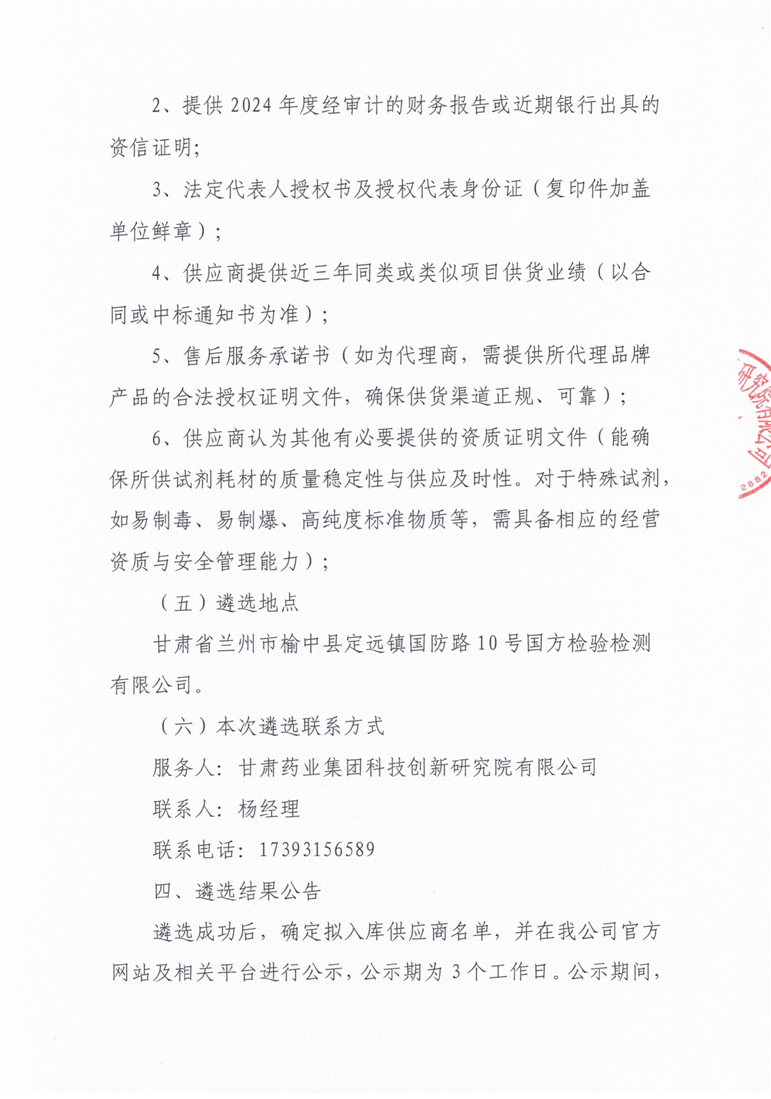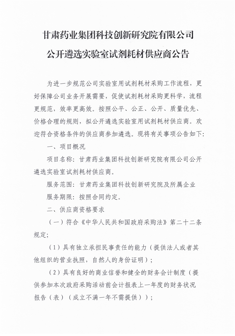 甘肃药业集团科技创新研究院有限公司公开遴选实验室试剂耗材供应商公告