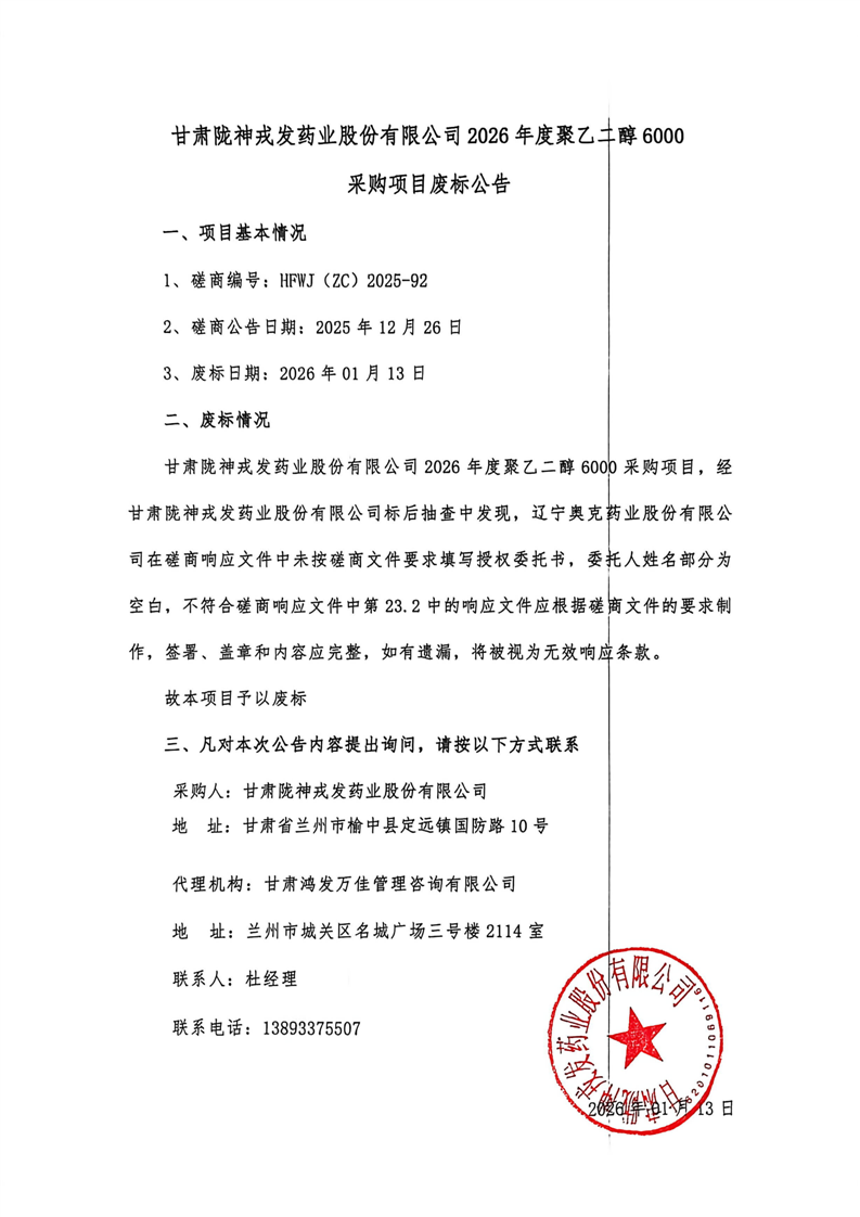 甘肃陇神戎发药业股份有限公司2026年度聚乙二醇6000采购项目废标公告