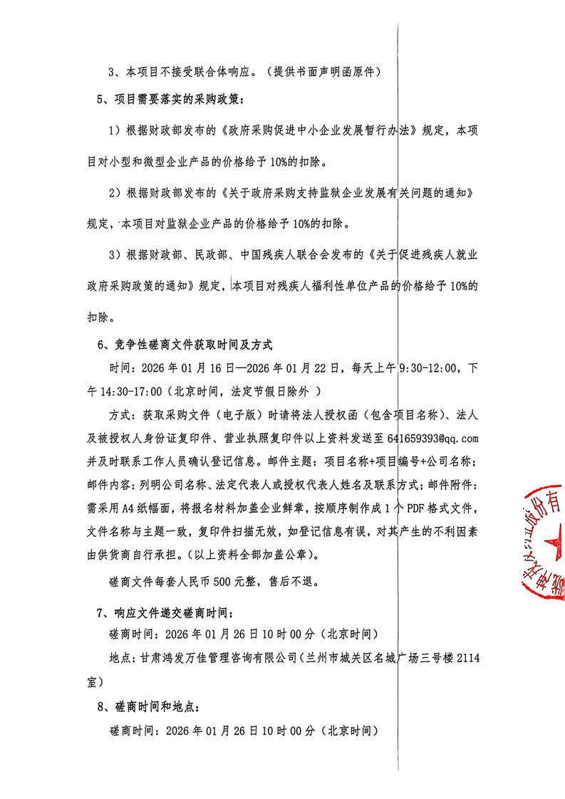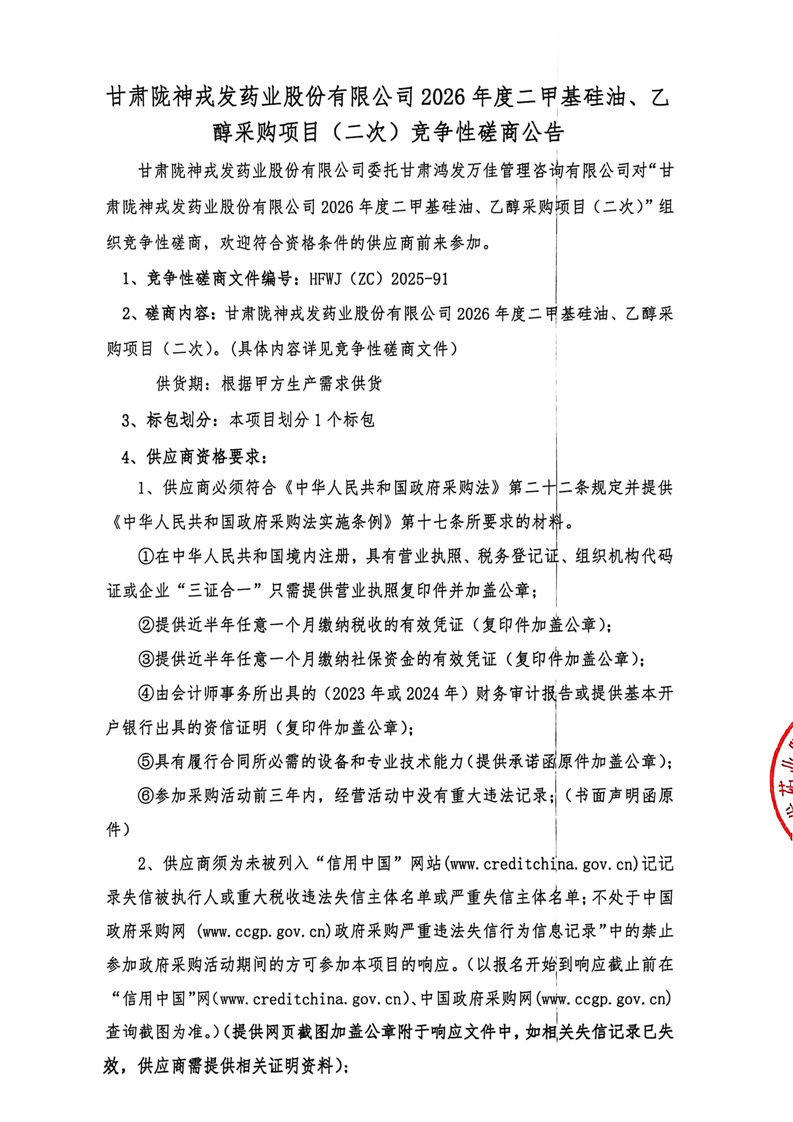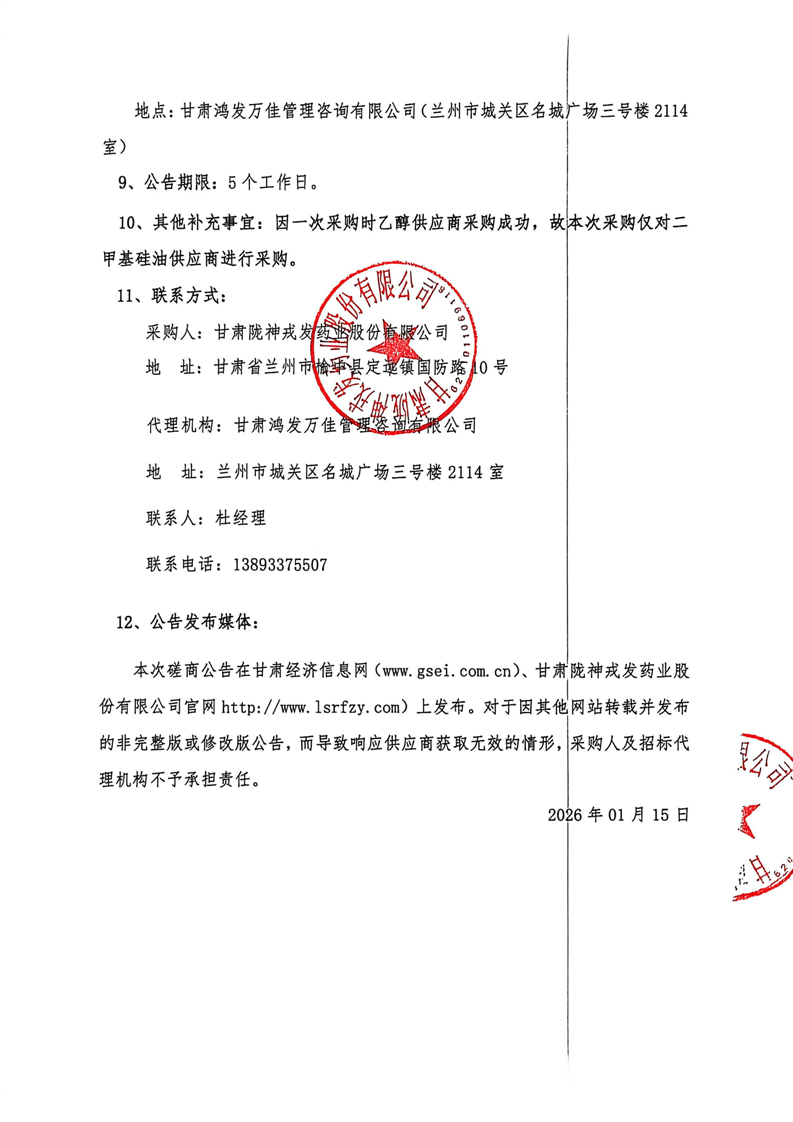 甘肃陇神戎发药业股份有限公司2026年度二甲基硅油、乙醇采购项目(二次)竞争性磋商公告
