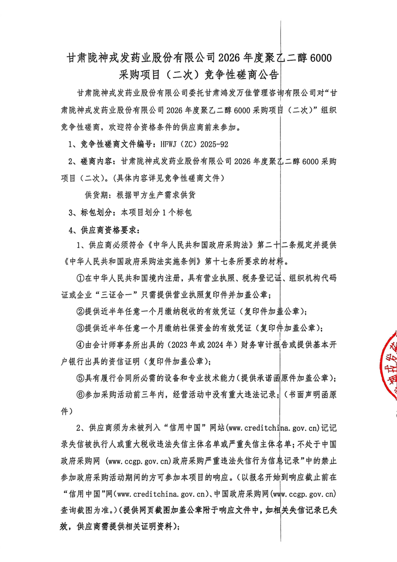 甘肃陇神戎发药业股份有限公司2026年度聚乙二醇6000采购项目(二次)竞争性磋商公告