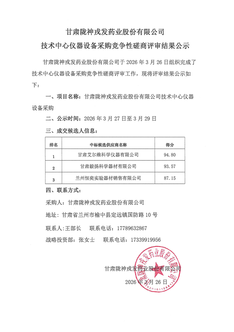 甘肃陇神戎发药业股份有限公司技术中心仪器设备采购竞争性磋商评审结果公示
