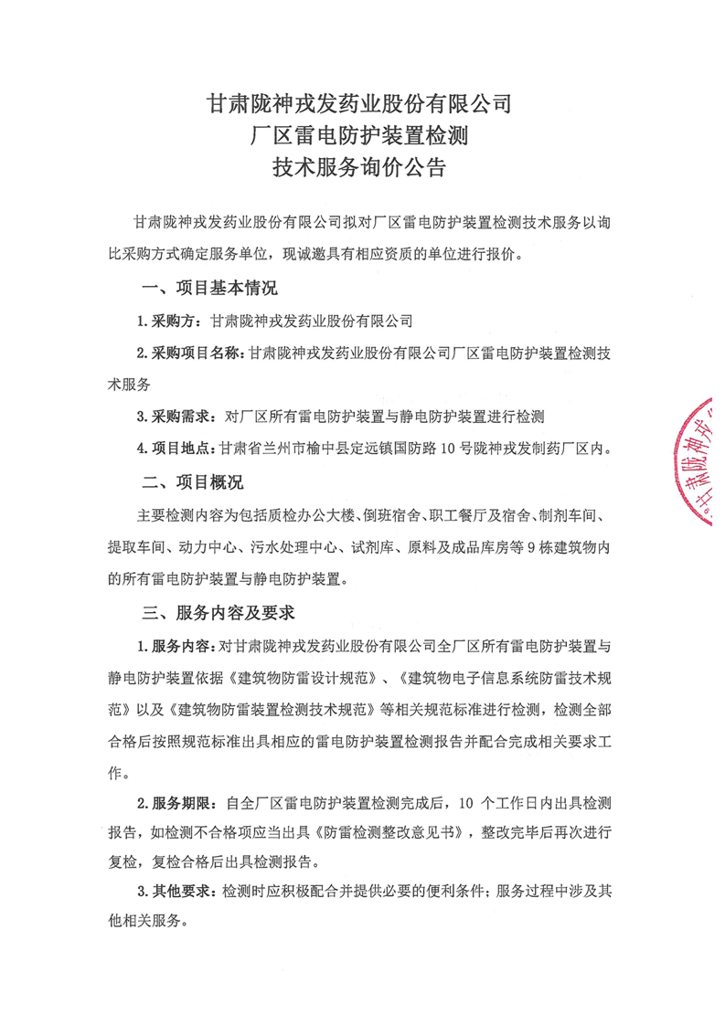 甘肃陇神戎发药业股份有限公司厂区雷电防护装置检测技术服务询价公告