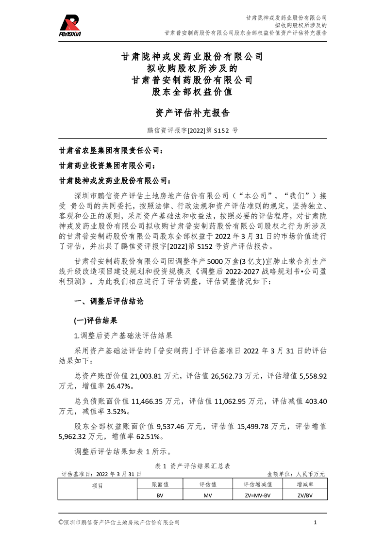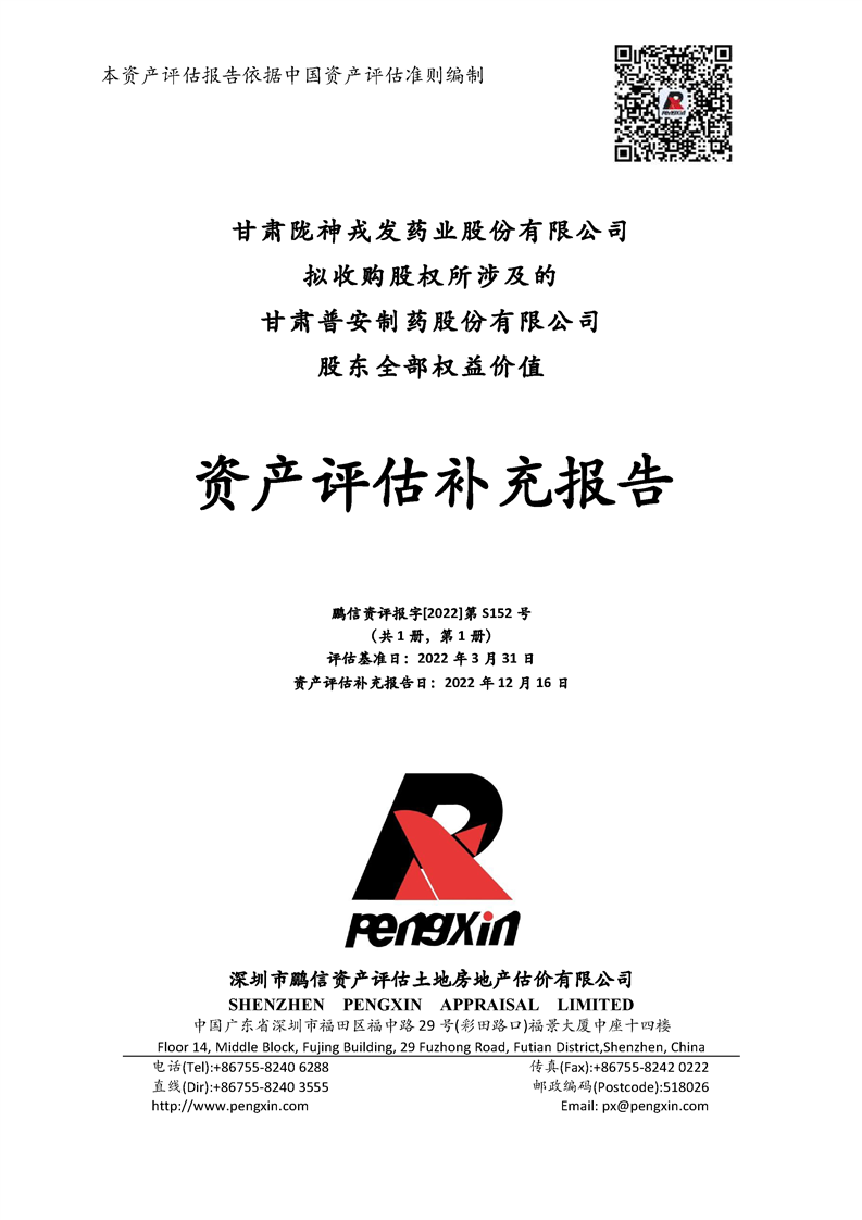甘肃普安制药股份有限公司全部权益价值资产评估补充报告-鹏信资评报字[2022]第S152号