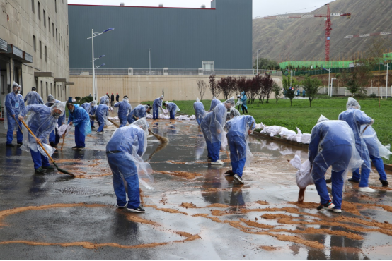上午10点,应急演练正式开始,应急演练模拟情景为药品生产车间2台反应器底部封头因地震损坏,尚未反应的液体原材料大量“泄漏”,因地震造成企业污水收集系统受损,部分“泄漏物”进入雨排系统排出厂界流向西河,一旦“泄漏物”流入西河,将造成严重的生态环境污染和社会影响。“事故”发生后,陇神戎发第一时间启动了公司突发环境应急预案,集结应急救援70余人,分5个小组(1、现场指挥组2、医疗救护、信息上报组3、警戒保卫组4、现场救援组5、物资保障、应急检测组)开始组织生产区员工疏散撤离,紧急关闭生产区电源,围堵“泄漏物”,切断雨排系统,导入事故池。同时信息上报组向兰州高新区建设(环保)局报告“事故”详细情况。