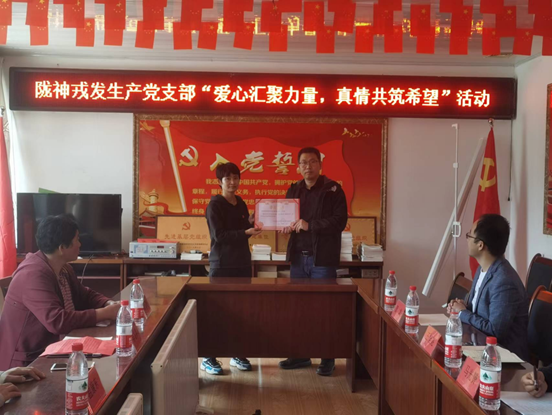 代表生产第一党支部和生产第二党支部为杜强爱人捐赠善款