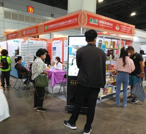 此次展会,陇神戎发受邀与(泰国)唐明本草有限公司联合参展,展会上特别定制了陇神戎发门头及背景板,广告机液晶屏幕滚动循环播放公司宣传片和产品介绍。陇神戎发展位重点突出,主要展示了陇神戎发独家产品元胡止痛滴丸、七味温阳胶囊、复方丹参片等自有产品,重点推介宣传2021年已在泰国上市的保健产品黄芪当归胶囊。