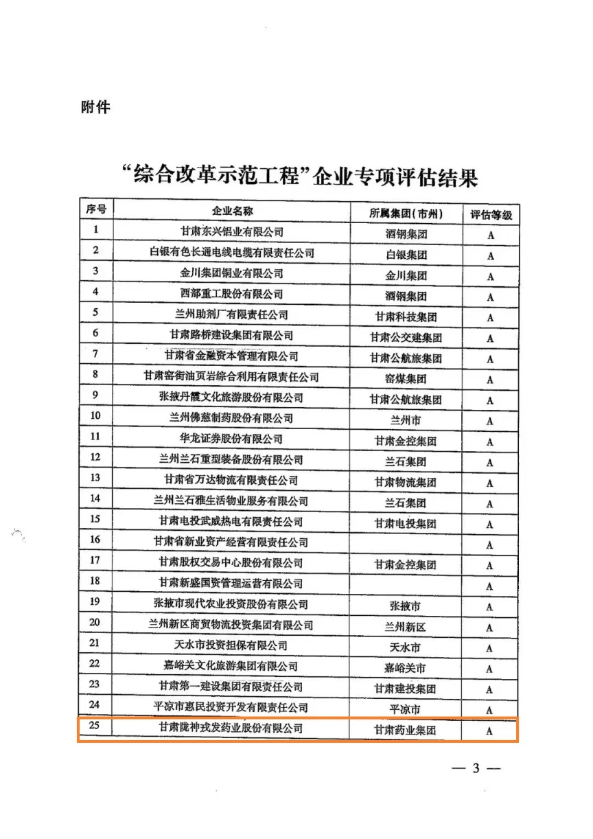 2019年,甘肃省国资国企改革推进工作领导小组办公室在全省遴选40户省属及省属二级企业和14户市属企业,利用三年时间,深入开展“综合改革示范工程”,全面落实国企改革“1+N”政策文件,紧紧围绕“五突破一加强”综合施策深入推进改革。近日,经甘肃省国资国企改革推进工作领导小组办公室会议研究审定,甘肃陇神戎发药业股份有限公司在“综合改革示范工程”专项评估中荣获A级评定。