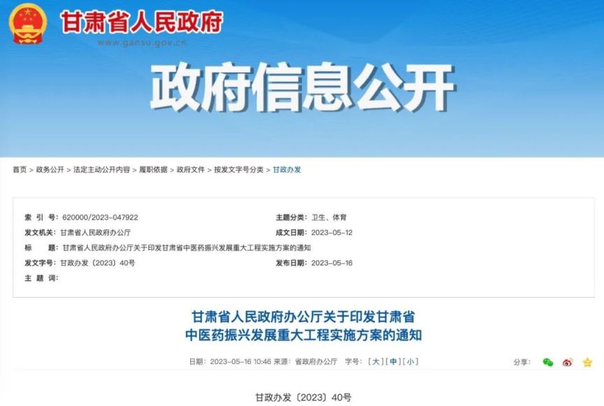 甘肃省人民政府办公厅关于印发甘肃省中医药振兴发展重大工程实施方案的通知
