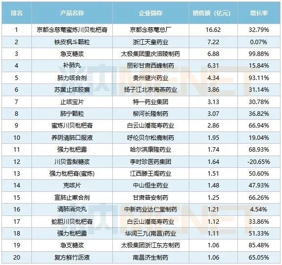 2022年中国城市实体药店终端止咳祛痰平喘中成药品牌TOP20