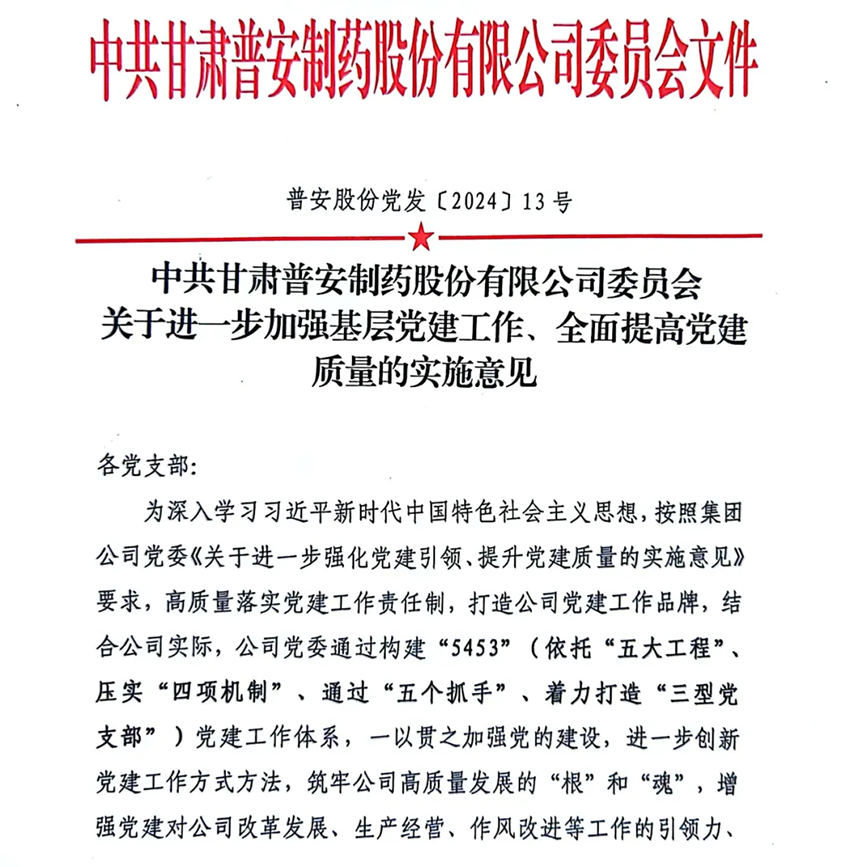 2024年,甘肃普安制药股份有限公司党委在甘肃药业集团党委的正确领导下,坚持党建引领,以“深耕细作挖潜能,降本增效做贡献”为主线,锚定“党建引领+节能降耗”的目标,扎实推进党建与主业深度融合,切实将党建优势转化为发展优势。