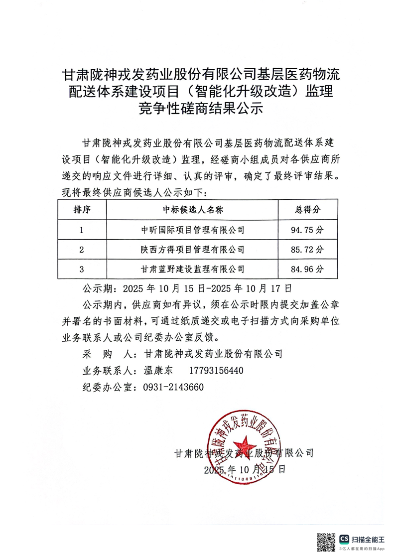 甘肃陇神戎发药业股份有限公司基层医药物流配送体系建设项目(智能化升级改造)监理竞争性磋商结果公示