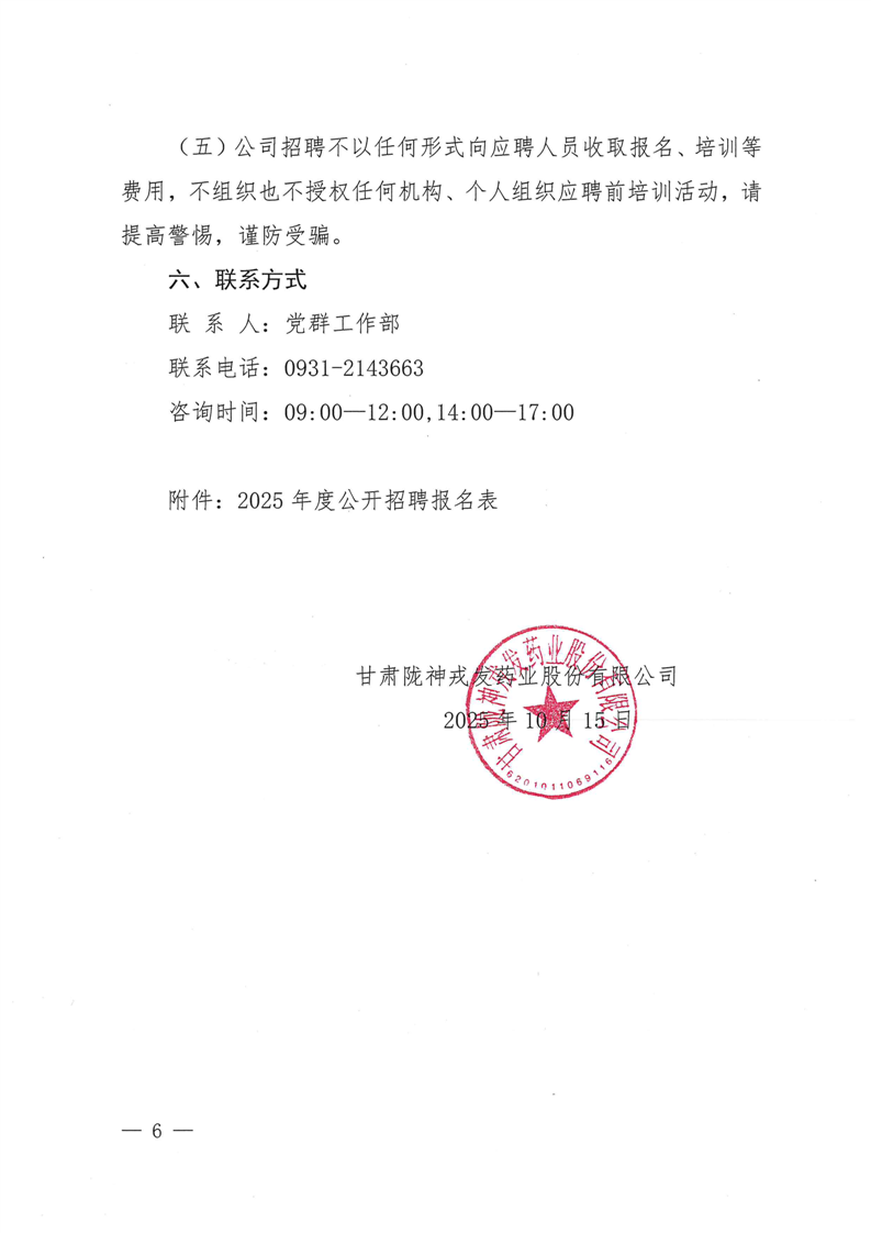 甘肃陇神戎发药业股份有限公司关于公开招聘质量控制岗位人员的公告